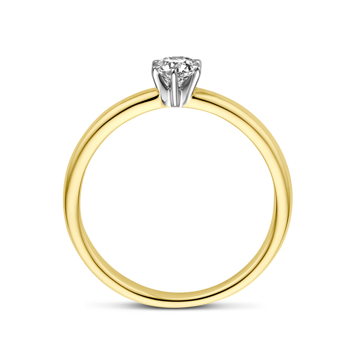 14k Bicolor geel- en witgouden ring uitgevoerd met een schitterende diamant. De ring heeft een breedte van 5mm.