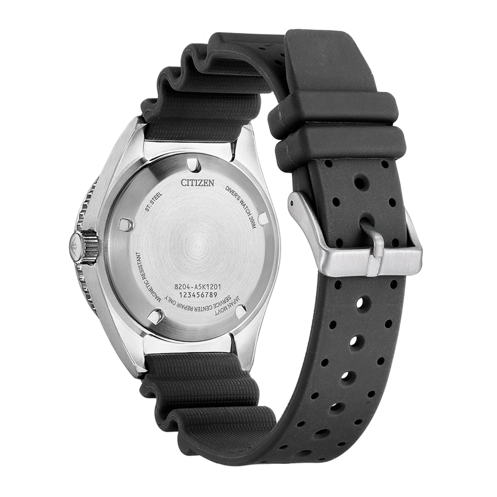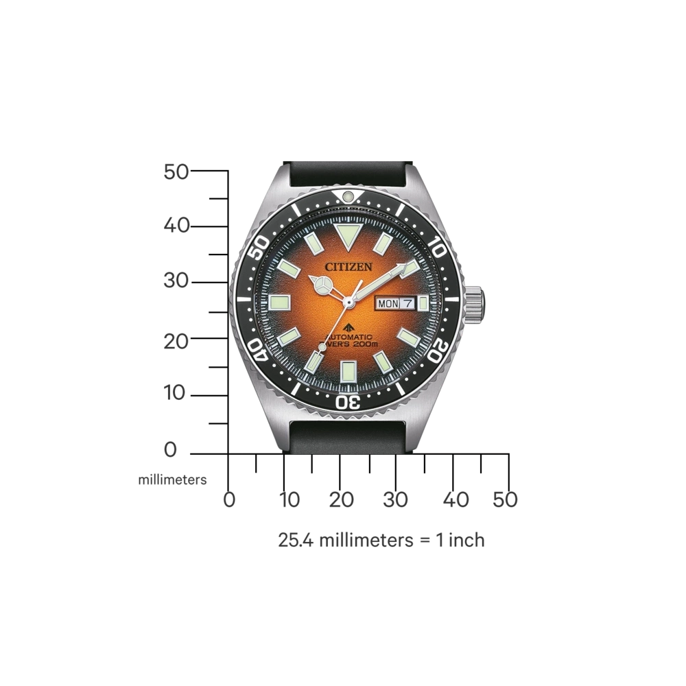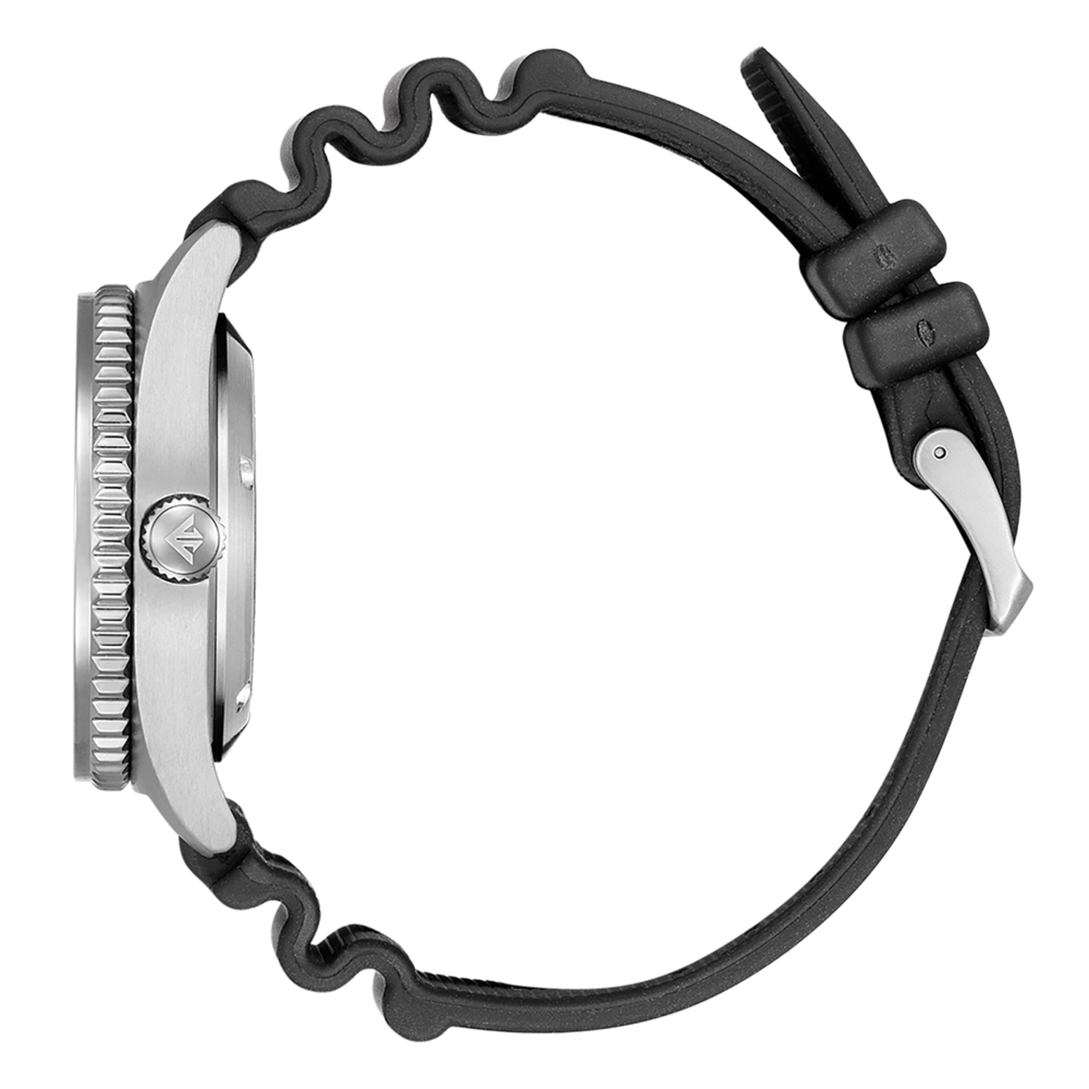 ISO-gecertificeerd mechanisch duikershorloge in een nieuwe uniseks maat. Met roestvrijstalen kast en zwarte rubber armband, kristalglas en oranje wijzerplaat met verlichte wijzers en indexen. Uitgerust met het mechanische kaliber 8204 met een gangreserve van 42 uur, -20/+40 seconden nauwkeurigheid/dag en waterdichtheid tot 20 bar. Diameter van de kast: 41 mm.