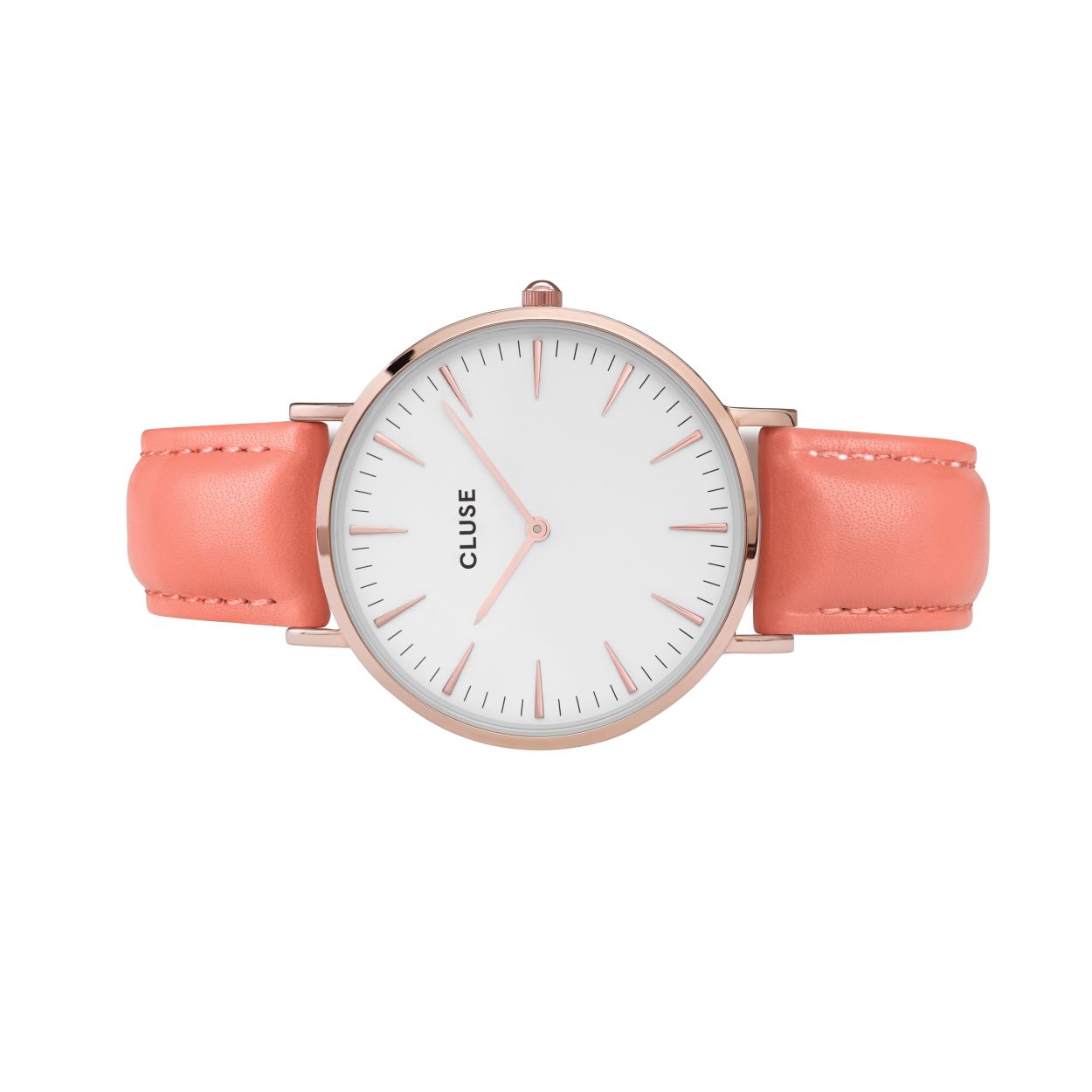 Dit is een horloge van Cluse. De kast is gemaakt van messingen de kleur van de kast is rose goud. De band is gemaakt van leer en de kleur van deze band is roze.