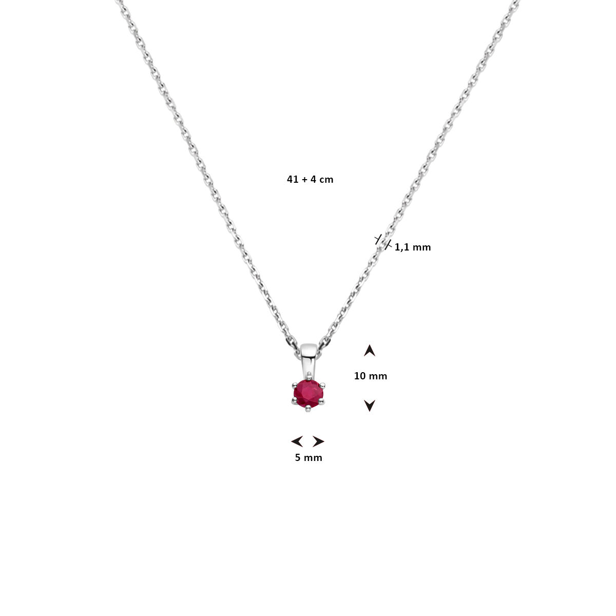 Gerhodineerd 925 zilveren collier met een geboortesteen hanger. Het collier heeft een draaglengte van 41cm en een extensie van 4cm. De schakelbreedte is 1.1mm. Uitgevoerd met een karabijn sluiting. Robijn is de geboortesteen van de maand juli.