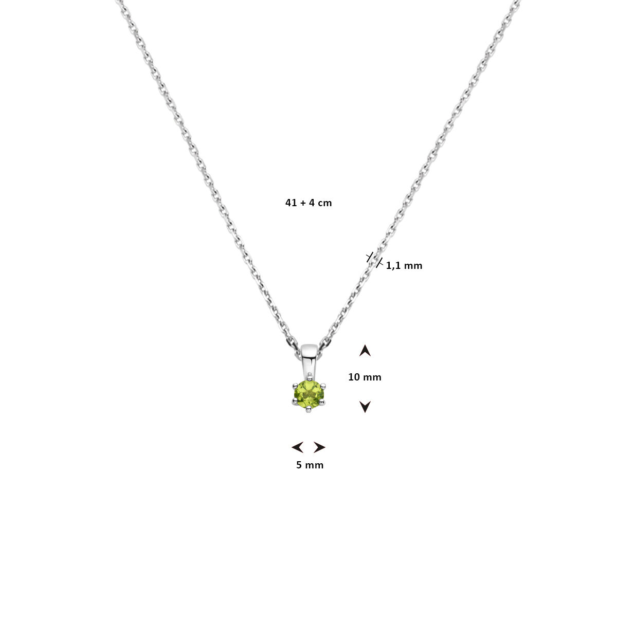 Gerhodineerd 925 zilveren collier met een geboortesteen hanger. Het collier heeft een draaglengte van 41cm en een extensie van 4cm. De schakelbreedte is 1.1mm. Uitgevoerd met een karabijn sluiting. Peridoot is de geboortesteen van de maand augustus.
