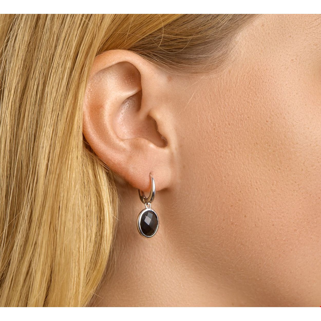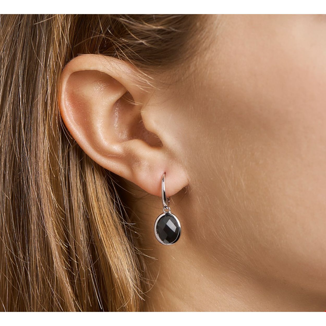 Chique gerhodineerd zilveren oorringen uitgevoerd met schitterende onyx hangers en een stevige scharnier sluiting. De klapoorringen hebben een totale hoogte van 2.6cm en de hanger heeft een afmeting van 14.5x10mm.