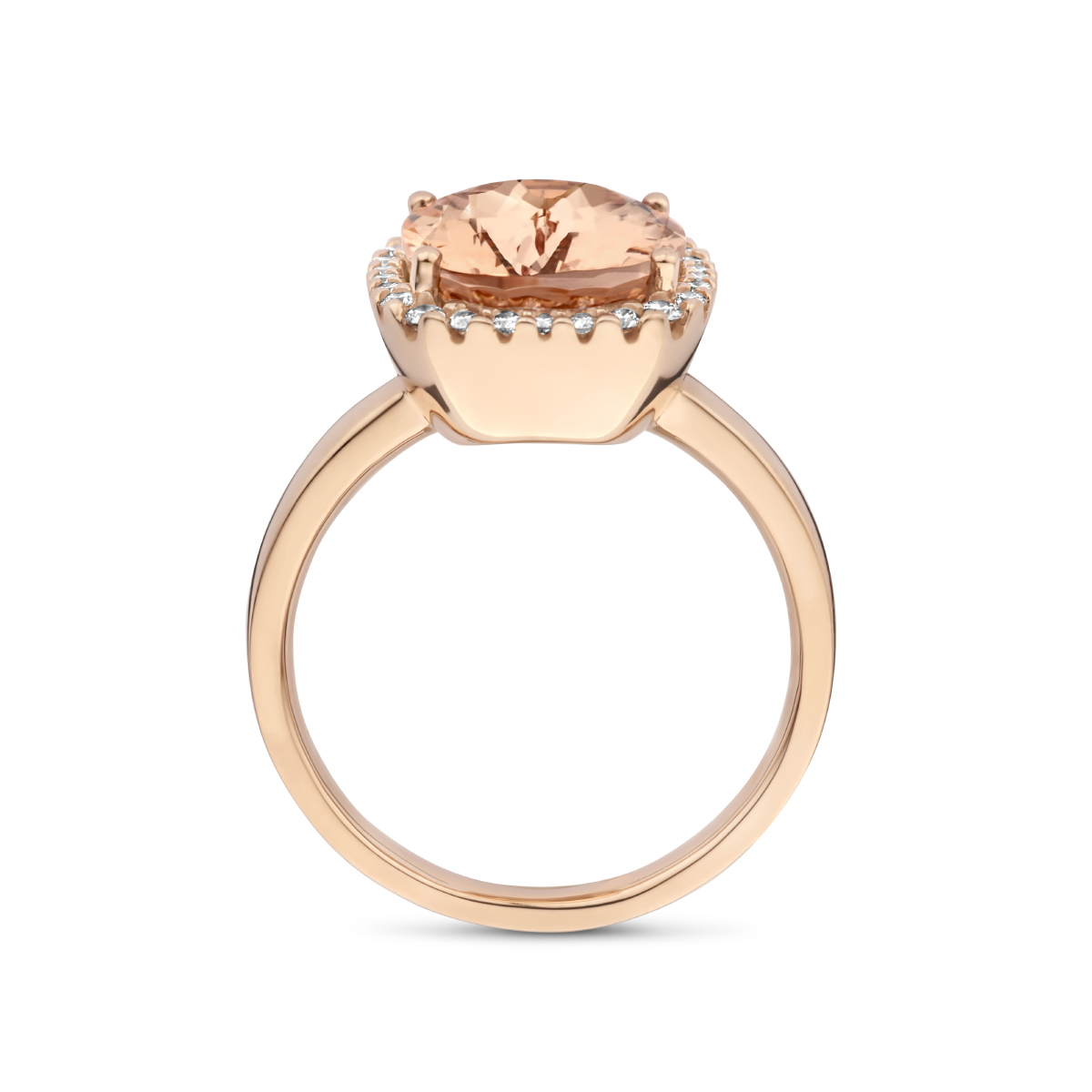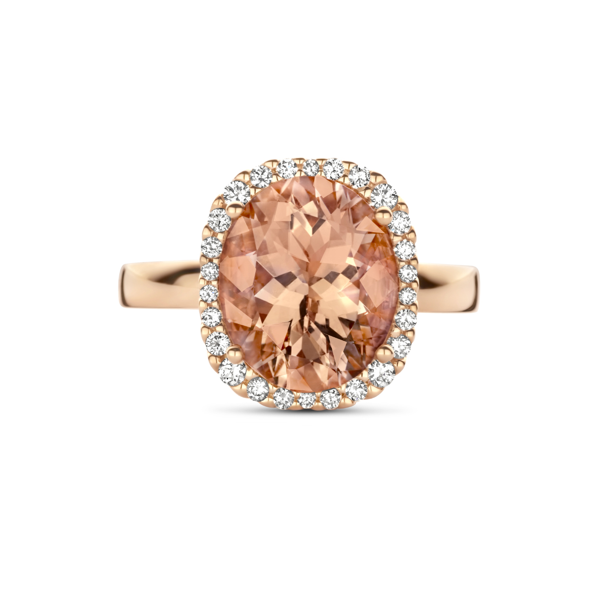 14k Rosegouden ring uitgevoerd met een diamant rij en een schitterende morganiet steen van 12x10mm. De ring heeft een breedte van 14mm.
