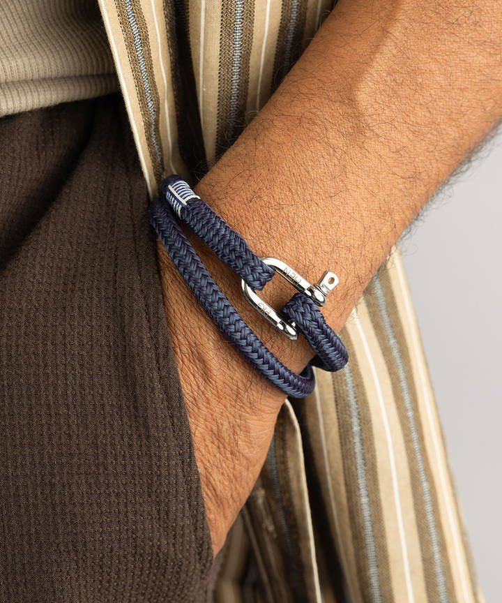 De Salty Steve armband, is een stijlvolle canvas juweel in marineblauw en zilverkleur, geschikt voor polsmaten van 18 cm. Perfect te combineren met casual of nautische outfits. Draag hem alleen of in combinatie met andere armbanden voor een gelaagd effect. Een ideale aanvulling voor elke accessoirecollectie.