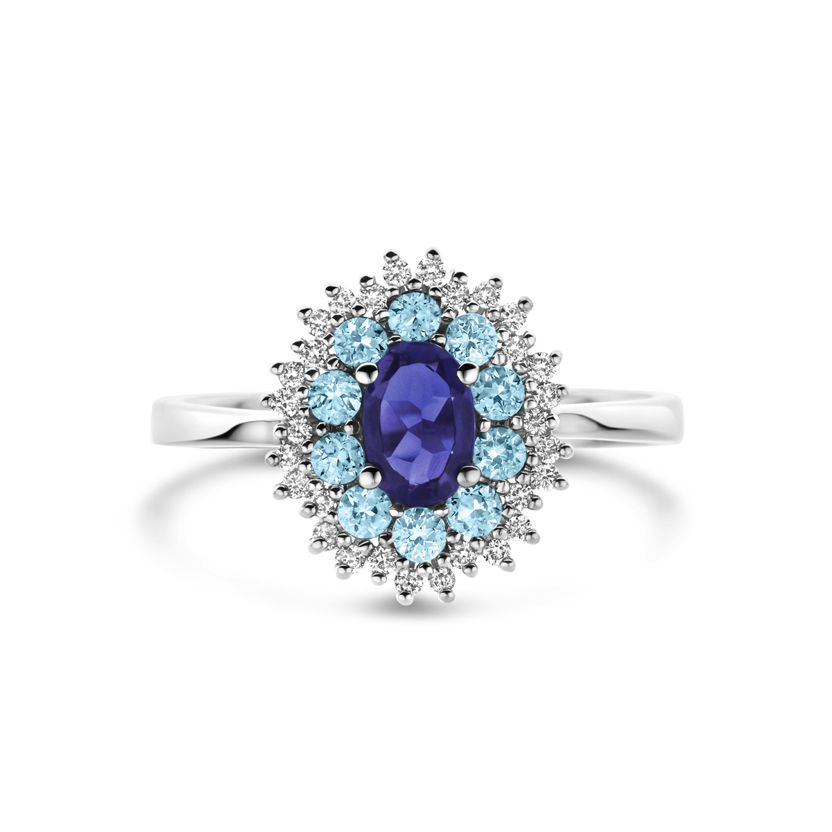 14k Witgouden ring uitgevoerd met ioliet, london blue topaas en diamant. De ring heeft een breedte van 13mm. Het totale diamantgewicht is 0.15ct.