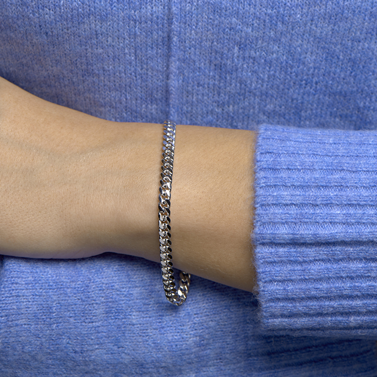 De Zilveren armband gourmette 6 zijdes geslepen heeft een breedte van 4,8 mm en is 19 cm lang.  Gemaakt van zilever en rhodium plating. De armband is perfect voor dagelijks gebruik of formele gelegenheden, en voegt een stijlvolle touch toe aan elke outfit.
